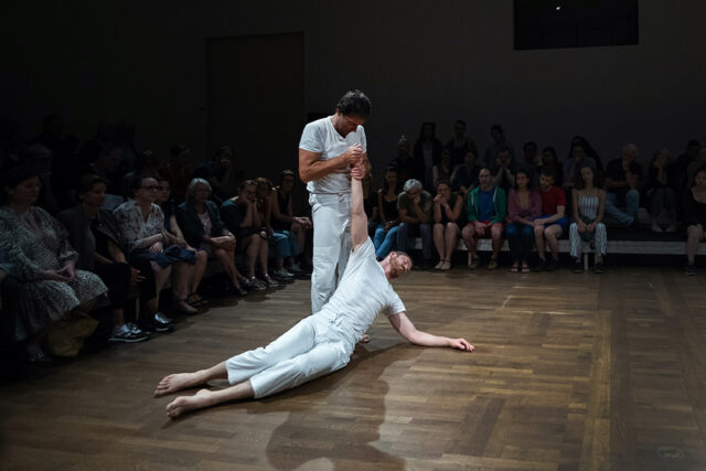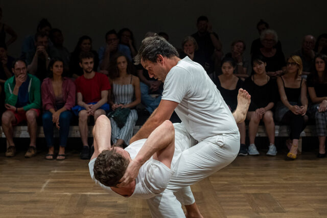 Empoignades, étreintes et embrassades, très physiques, suggérées par le titre, mais aussi surenchère virtuose rappellent alors les circonstances de la création au sortir du Conservatoire de Lyon. La fougue, l’immédiateté, la rapidité sont toujours contredites par la fatigue, volontairement apparente, qui fait chuter pesamment les corps, rend audible l’essoufflement, et rend nécessaires ces temps d’attentes au bord de l’espace scénique comme autour d’un ring. Portés athlétiques, imbrications hasardeuses, le duo vire souvent au duel.