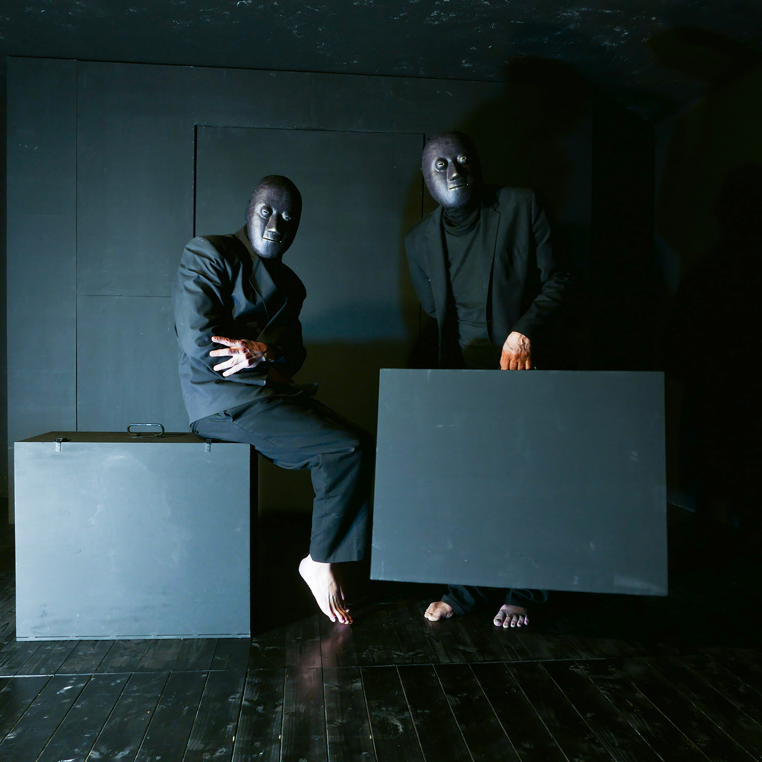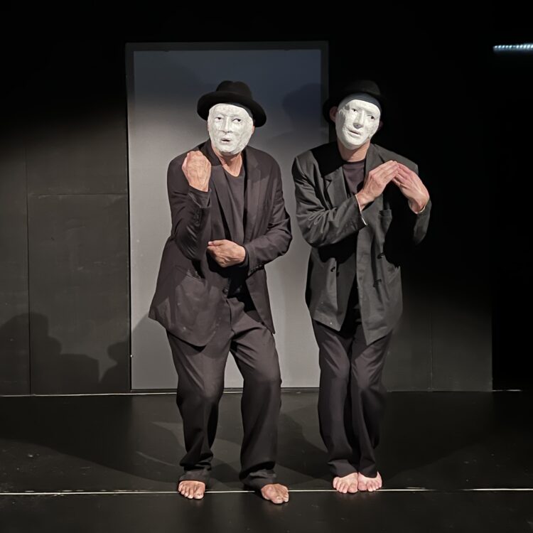 En masques blancs et chapeaux noirs, le duo s’aventure dans les sphères entre l’animé et l’inanimé, le matériel et l’immatériel, le vivant organique et l’artefact mécanique. Si leurs visages ne semblent pas encore abandonner notre monde, on sent instinctivement qu’ils n’en font plus tout à fait partie. Entre nouvelles libertés et frayeurs de l’insondable, Josef Nadj – qui vient des beaux-arts, du mime et des arts martiaux – marque ici un retour aux sources, créant un espace de tension entre l’humain et la marionnette, où le corps transcende les limites de sa réalité charnelle.