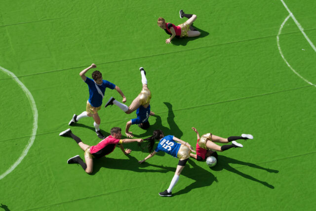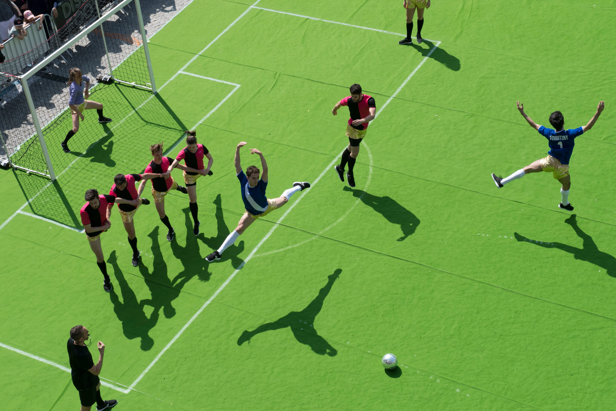 Ce match-performance repose sur les règles et le fonctionnement des matchs de foot. Sur cette base, les interprètes combinent une partition chorégraphique préétablie avec des possibilités d’improvisation sans limite. Le tout en respectant une règle d’or : on ne doit pas courir.