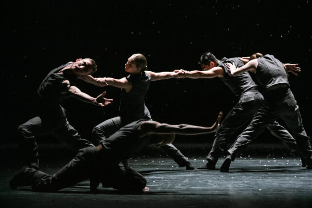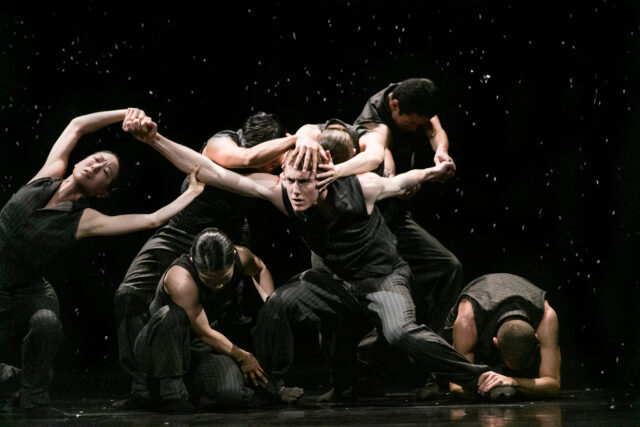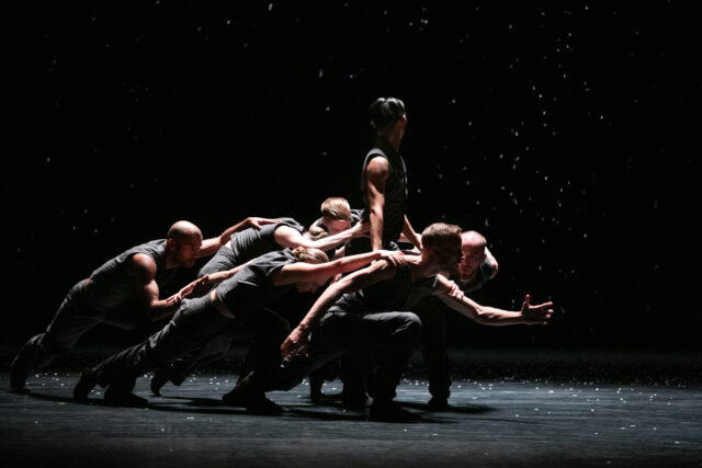 Dans Solo Echo, Crystal Pite travaille le groupe comme un seul homme. Traitant les sept danseurs qui occupent le plateau comme une matière organique en perpétuelle mutation, la chorégraphe nous happe par ce jeu de métamorphoses que vient soutenir une écriture fine et solide comme un fil de soie. Captivant le regard, les danseurs dessinent un paysage qui s’insinue lentement dans la conscience tandis que la chorégraphie tend vers l’immobile sans jamais rompre le mouvement. L’amour, la perte et l’acceptation sont au cœur de cette œuvre où le temps s’étire et ondoie. Les deux sonates pour violoncelle et piano de Brahms, ouvrent encore l’espace et nous transportent dans une contrée mystérieuse en hiver.