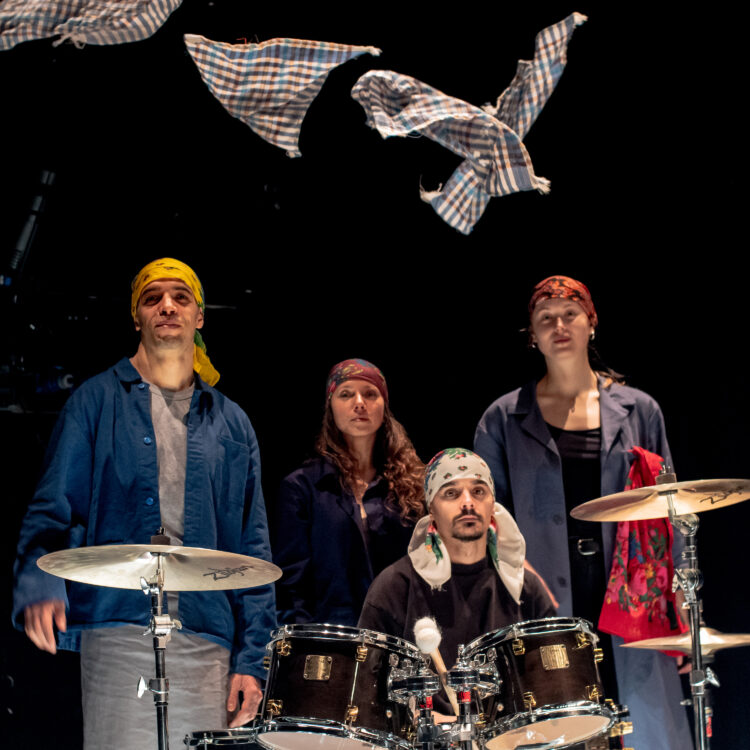 Les quatre interprètes d’OM(S) DE MENAGE arpentent le sol de leurs pas chaloupés, en voltes et rebonds, dessinent ce territoire de leurs marches scandées, portant en leurs déplacements la réminiscence des femmes de leurs vie, un hommage à leurs mères, leurs ancêtres, leurs sœurs, leurs camarades. Se jouant des passerelles entre danse contemporaine, danse hip-hop et danses traditionnelles, les interprètes échafaudent des dialogues inédits entre musique et danse, les « drums », en live, accentuent ces partitions musicales du dansé vers cet espace ouvert à l’autre. Une ode à « être ensemble ».